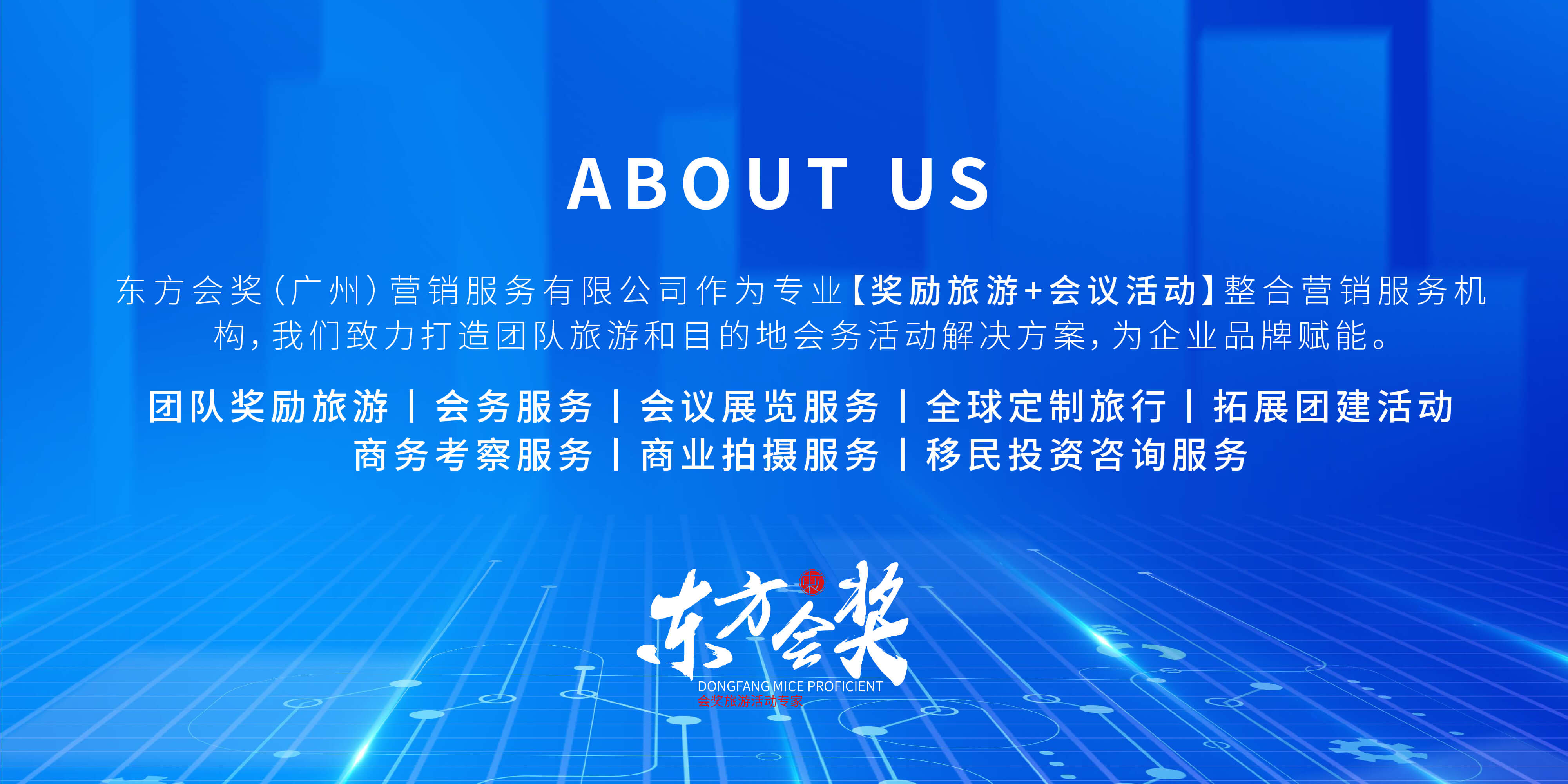 東方會獎(廣州)營銷服務(wù)有限公司 作為專業(yè)會獎旅游活動專家,我們致力打造專業(yè)團(tuán)隊旅游和目的地會務(wù)會展解決方案,為企業(yè)品牌賦能。 基于對商業(yè)客戶需求的深刻理解和豐富的服務(wù)經(jīng)驗(yàn),東方會獎成功實(shí)現(xiàn)從單一服務(wù)到整合服務(wù)、從簡單服務(wù)到高附加值服務(wù)、從線下服務(wù)到覆蓋線上線下的整合營銷服務(wù)布局,旗下東方會獎、途蘭朵旅行、左契文化、途蘭朵科技、全球開拓者等各業(yè)態(tài)的專業(yè)子公司相繼成立。目前,東方會獎已經(jīng)在中國主要經(jīng)濟(jì)區(qū)域建立了完善的服務(wù)網(wǎng)絡(luò),覆蓋廣州、深圳、佛山、杭州、成都、貴陽、西安、福州、廈門、桂林、長沙等核心城市。 成立至今,東方會獎一直專注于為新零售、保險、金融、直銷等機(jī)構(gòu)客戶提供“一站式”整合營銷服務(wù),業(yè)務(wù)涵蓋:團(tuán)隊獎勵旅游,目的地會務(wù)服務(wù),會議展覽服務(wù),全球定制旅行,拓展團(tuán)建活動,商務(wù)考察服務(wù),專業(yè)旅行拍攝服務(wù)。為企業(yè)品牌實(shí)現(xiàn)真正的全案整合營銷。